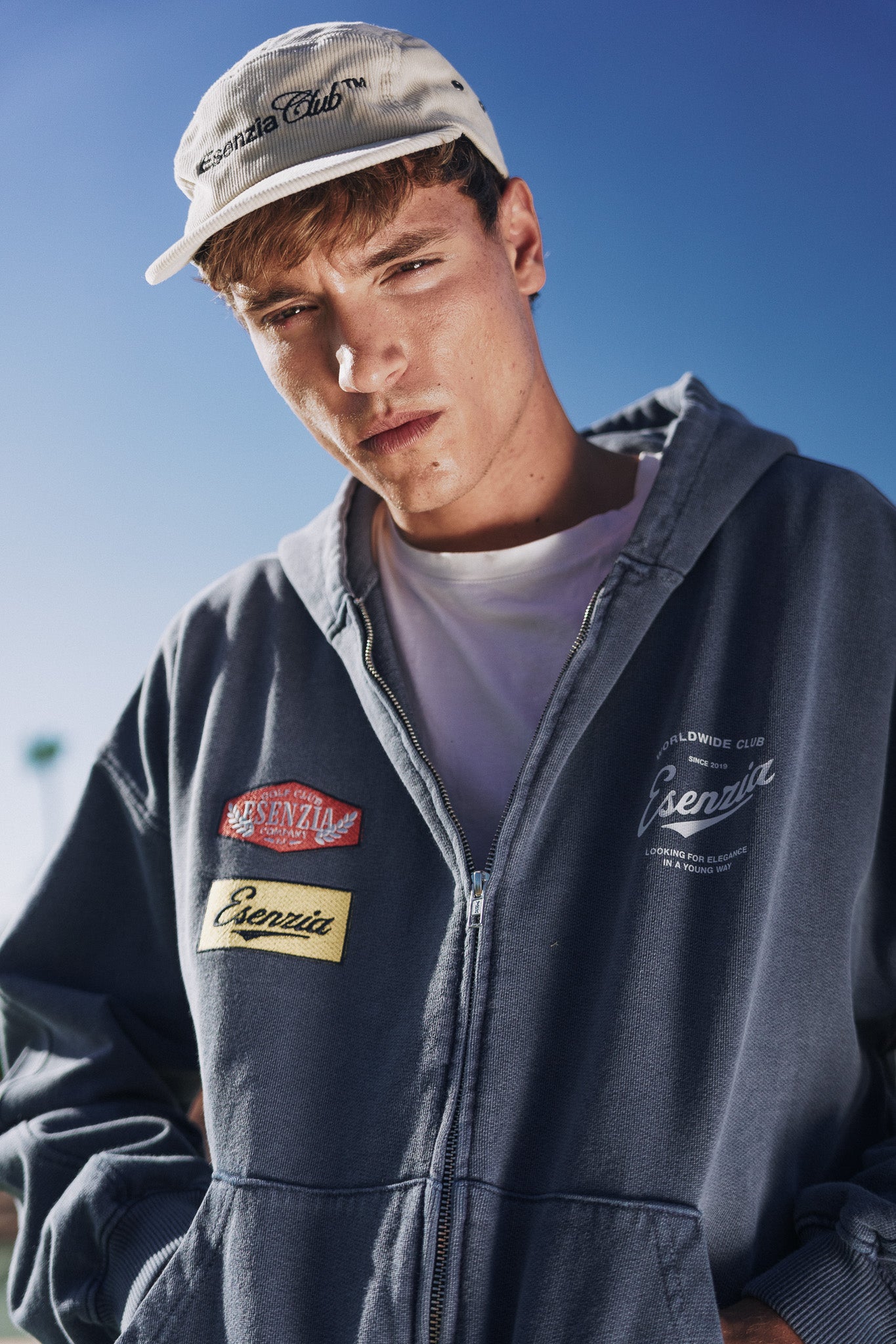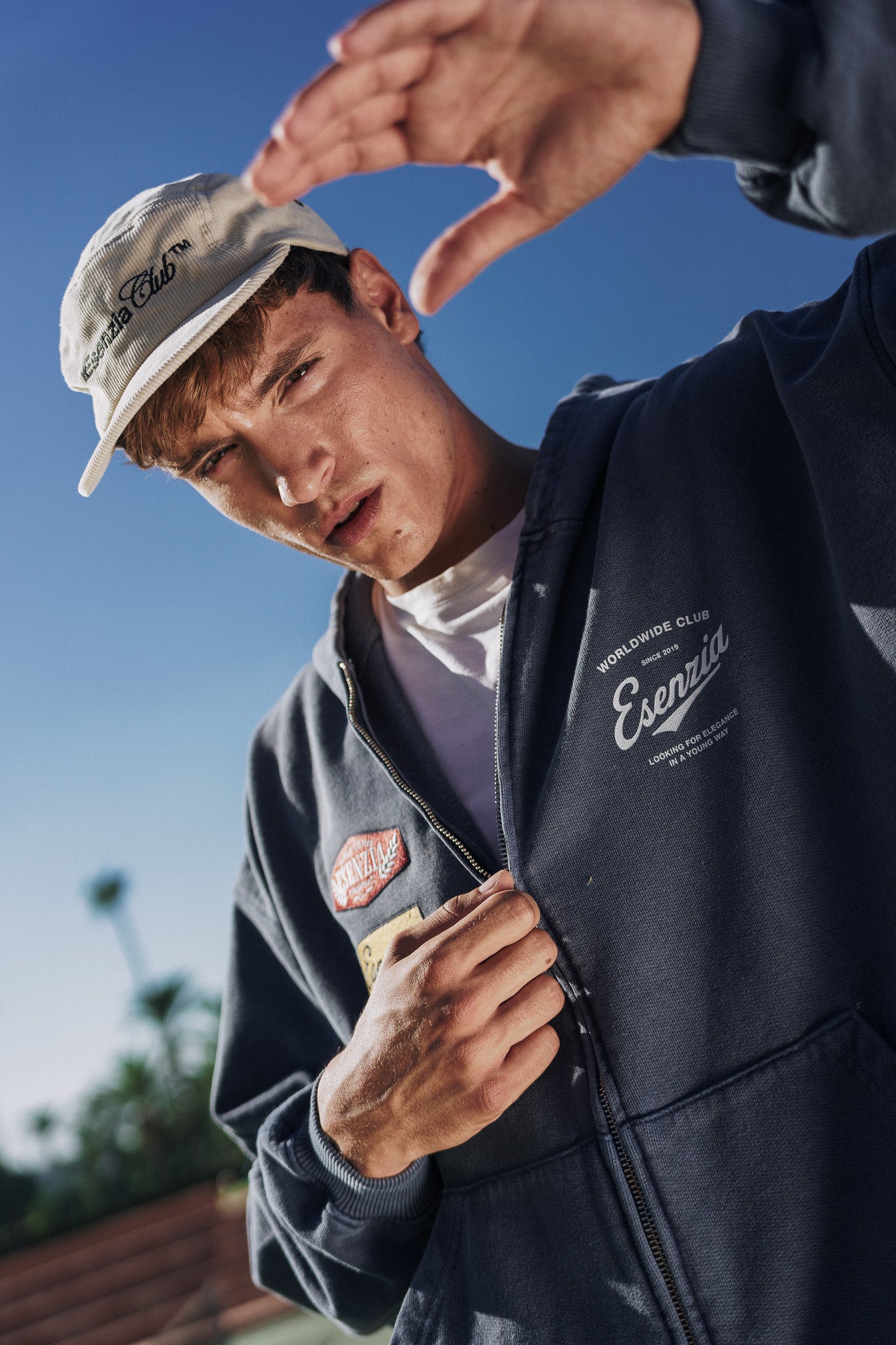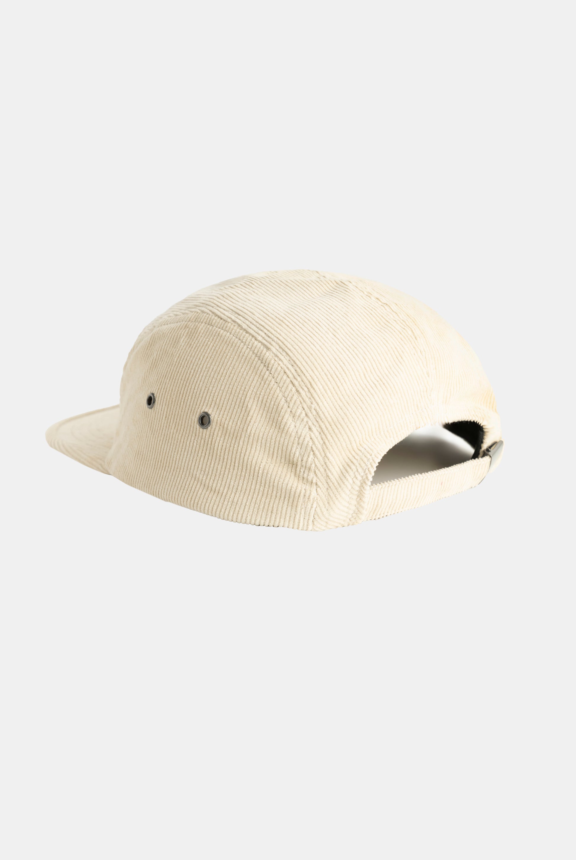 Cap made from 100% cotton corduroy with a 5-panel design and a flat brim. Features embroidered artwork on the front and a fabric strap with metal buckle and eyelet for a custom fit. Structured design with a soft texture and retro-inspired look.
