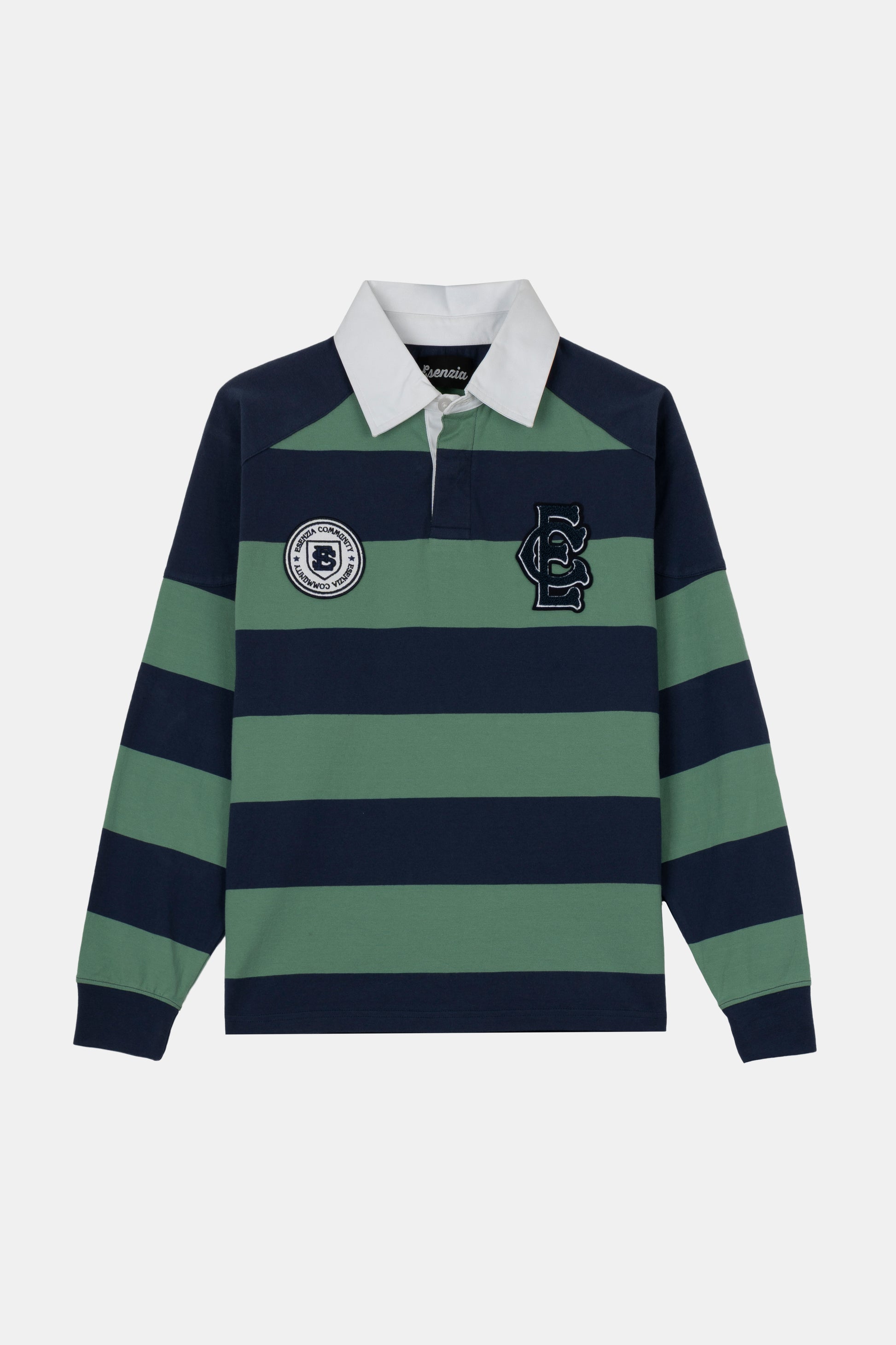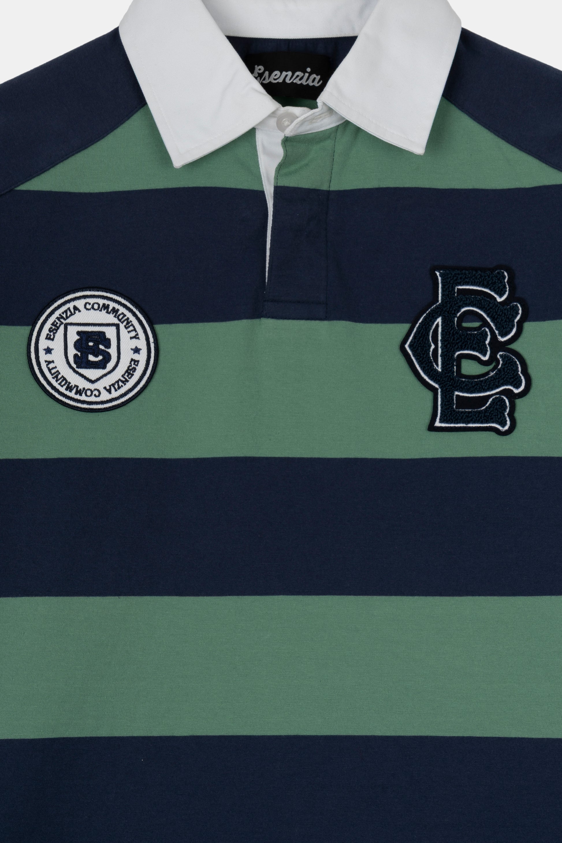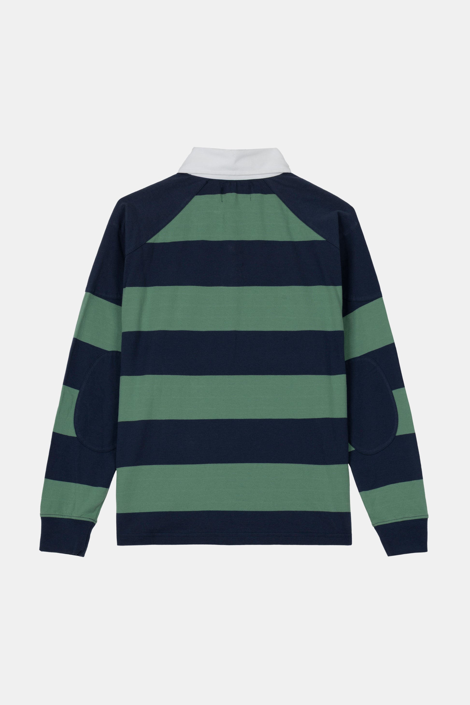 Long-sleeve polo made from 240 gsm cotton with green and blue stripes. Features embroidered patches on both chests, a denim-knit collar, and a peached finish for a soft touch and slightly worn-in look. Vintage-inspired piece with sporty detailing and a refined feel.
